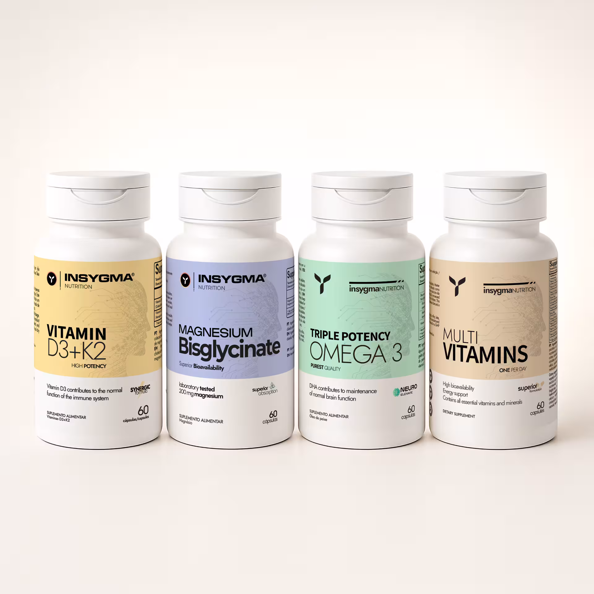 O Pack Essenciais Saúde da INSYGMA reúne quatro dos nossos suplementos mais avançados para reforçar o organismo diariamente e apoiar a saúde de forma completa e eficaz: